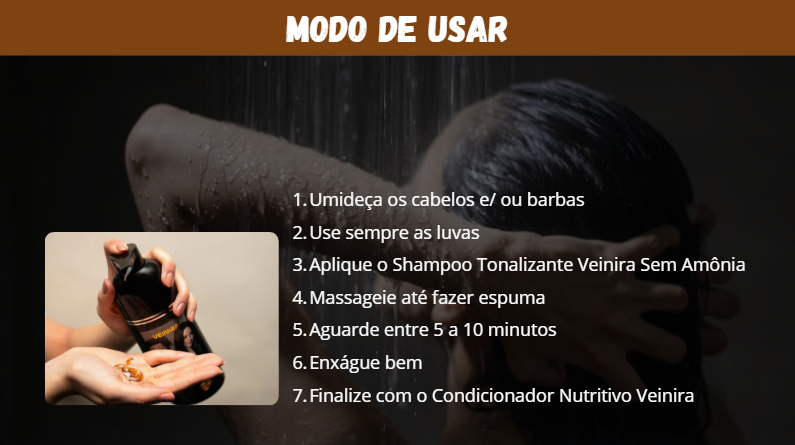 O Shampoo tonalizante Veinira é super prático, seguro e eficaz! Pode ser aplicado durante o banho, sem se preocupar, pois, Veinira não mancha a pele.